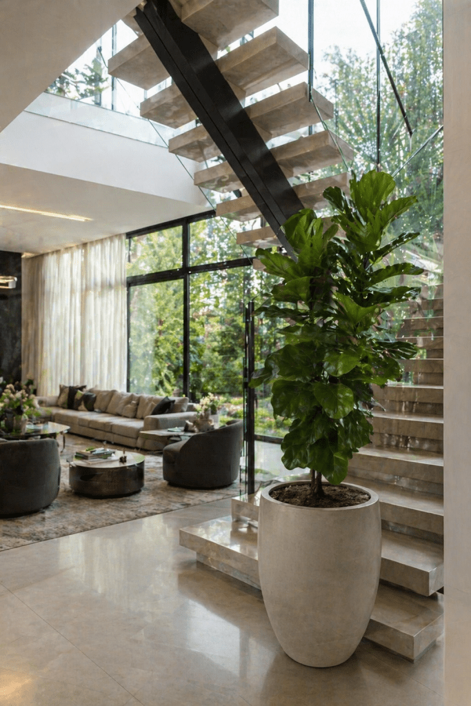Ficus-lira, embora precise de muita luz indireta, sempre longe da luz do sol, tem folhagens grandes, escuras e brilhantes que ocupam os espaços maiores.